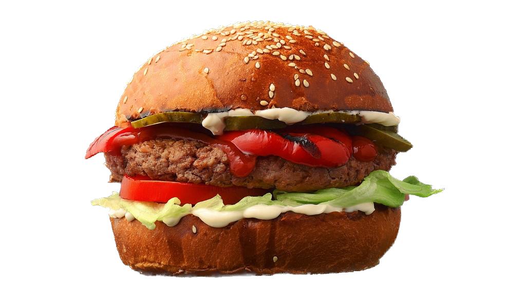 Chifla Brioche cu pârjoală de vită, ardei la grătar, sos sriracha, chilli, roșii, castraveți murați, salată iceberg și sos de susan.